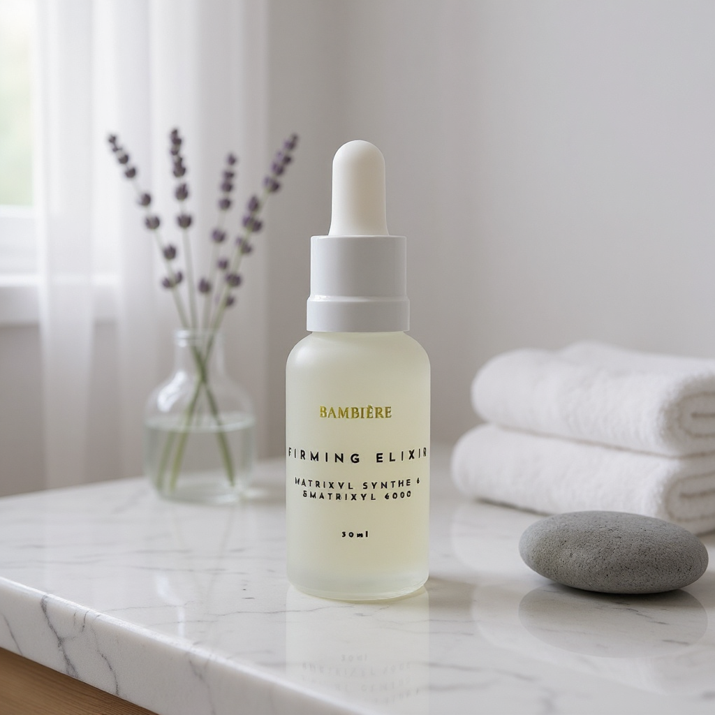 Firming Elixir with Peptides + Matrixyl Complex is Bambière’s targeted treatment for restoring elasticity and promoting youthful radiance. Formulated with a synergistic blend of Matrixyl®, Matrixyl® Synthe’6, and Matrixyl® 3000, this lightweight serum helps to boost collagen production, reduce the appearance of fine lines, and improve skin firmness over time.
