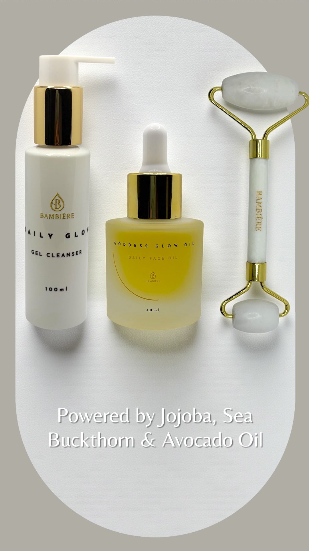 - Goddess Glow Oil (30ml) – Nourishing, lightweight blend with sea buckthorn, avocado, and jojoba oils for radiant, hydrated skin
