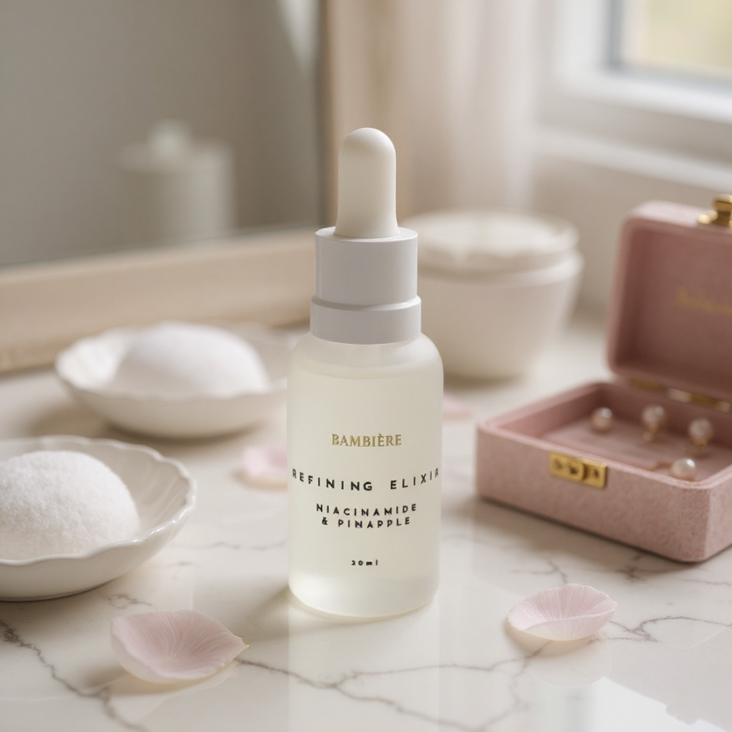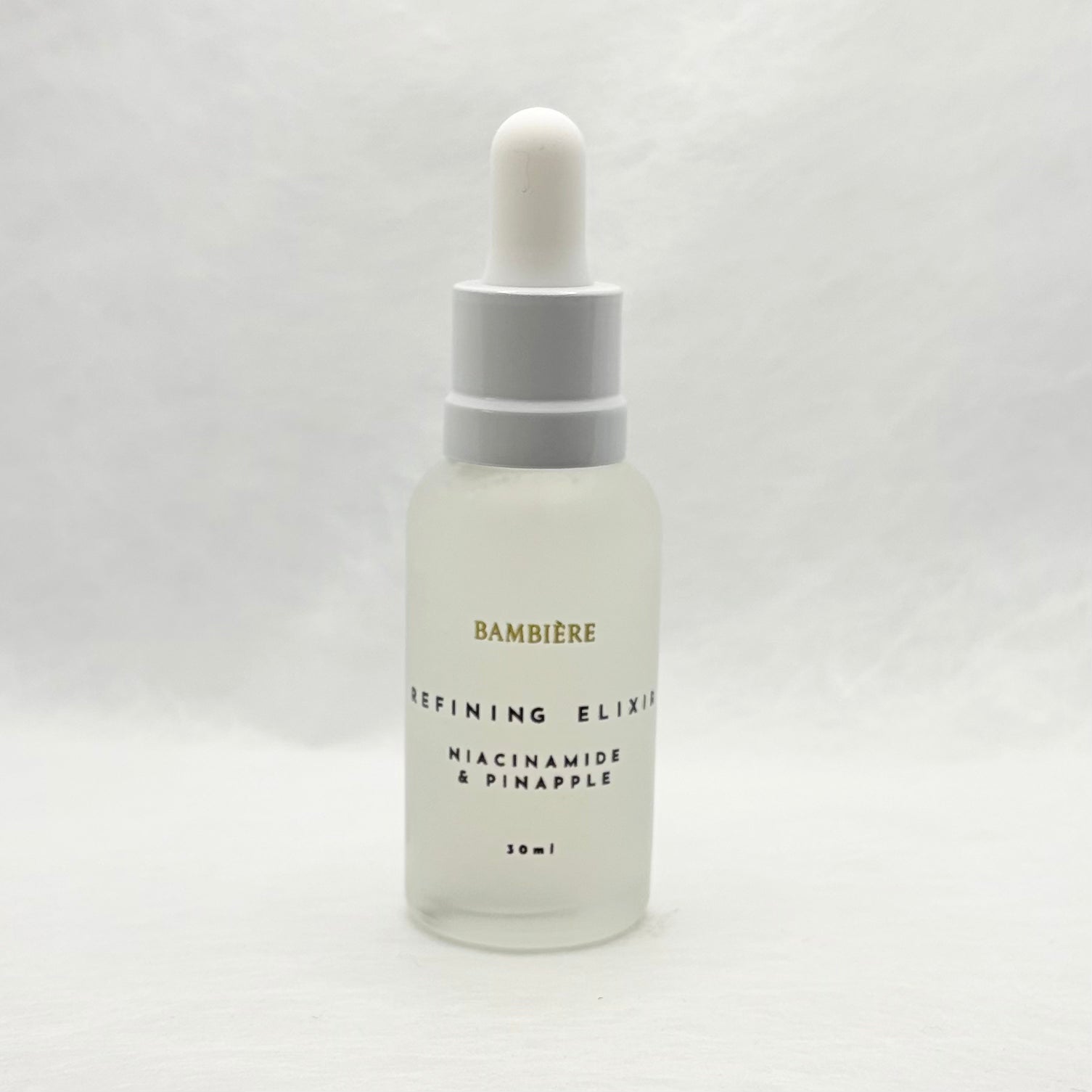 Meet Refining Elixir, Bambière’s daily treatment designed to restore clarity and balance. Formulated with 5% Niacinamide, this lightweight serum helps to even skin tone, minimise the appearance of pores, and support the skin’s natural barrier — leaving your complexion smooth, calm, and radiant.